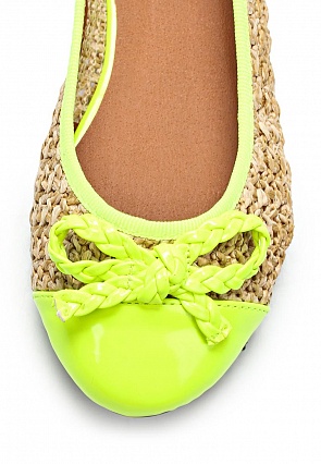 Балетки Camelot - контрастное сочетание фактур и цветов. Мыс и пятка выполнены из искусственной лаковой кожи неонового-желтого цвета. Боковые части из плетеного, перфорированного текстиля, который обеспечивает хорошую пропускаемость воздуха. Балетки отличает невероятная мягкость и гибкость, что обеспечивает комфортное положение стопы.