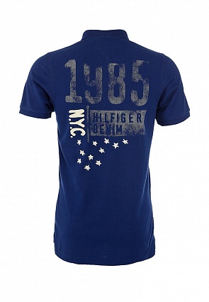 Поло Tommy Hilfiger синего цвета. Модель с двумя пуговицами на вороте, на груди – оригинальный объемный принт контрастного оттенка. Приведенные ниже измерения соответствуют размеру М.